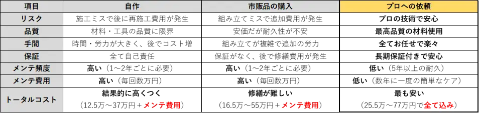 A: 初期費用だけを見ると自作や市販品が安く見えますが、頻繁なメンテナンスや修繕のコストを考慮すると、長期的にはプロに依頼する方が総合的に安くなります。また、プロに依頼することで、安心の保証と高品質な仕上がりが得られます。